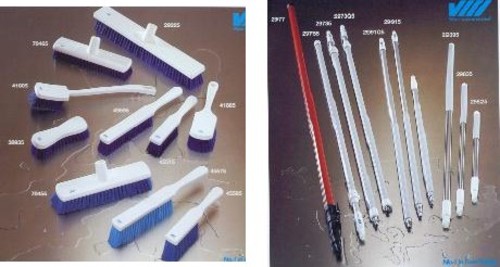 A range of Danish made cleaning equipment that features ergonomically designed handles and interchangeable tool heads. Three lengths of adjustable handles are available and are made of aluminum, glass fibre or stainless steel. A range of brushes, brooms, mops and squeegees can be attached to the Vikan handles. All products are designed to be durable and hygienic.