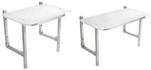 The seat folds down and is supported by two drop down stainless steel legs. These leg are a not adjustable in length. When folded up, the seat folds against the wall and the legs fold against the under side of the seat. The shower seat is attached to the wall by the stainless steel grade 316 fixing screws provided.