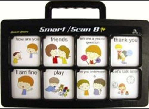The Smart/Scan 8 Pro Series 2 is a static display device with recorded speech. It can be accessed via direct touch or scanning and can record up to six levels with eight messages on each page. The device has built-in LED lights embedded in the overlay grid, a shatterproof moulded case and is designed to be drop-resistant.