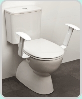 The toilet support is fixed rigidly to the seat mounting holes on the toilet pan. The plastic arms are nylon reinforced. The arms rests extend either side of the user when seated and provide support for the user to raise and lower themself on and off the toilet.