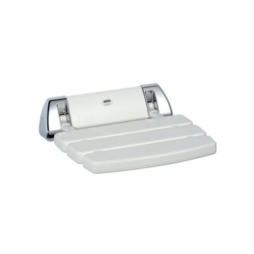 A wall mounted aluminium seat that folds up against the wall when not in use. Seat is comprised of three white slip resistant plastic slats. Aluminium frame can be finished in silver or bronze.