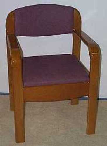 A static commode with a frame made from stained wood. It has a padded, vinyl seat and backrest to be used as a seat. It has wooden full length armrests and is not height adjustable.