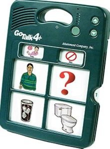 The GoTalk 4+ is a lightweight and portable recorded speech communication device with five levels and four message keys per level. It also has two extra keys for core vocabulary messages that stay the same over all levels.