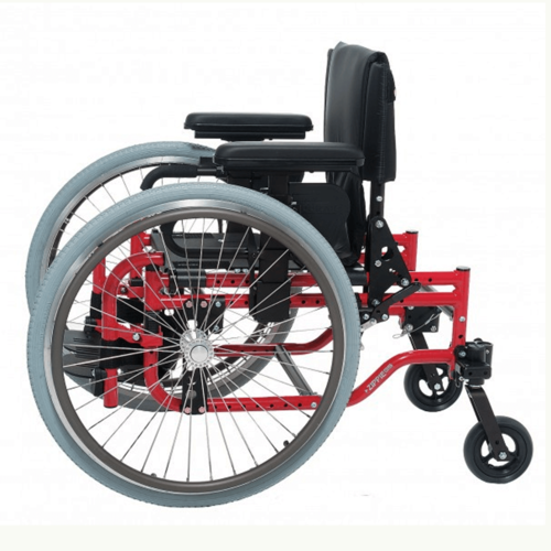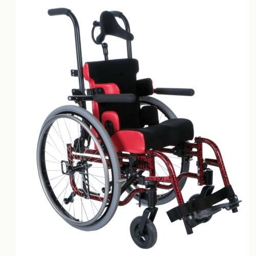 A children's manual wheelchair in a choice of folding or rigid frames, both of which can `grow` in seat size and height. The wheelchair is self propelled using a rear wheel drive action. It can be fitted with a one arm drive option or a can be set up in a reverse wheel configuration for front wheel drive propulsion for very small children.