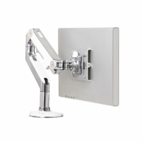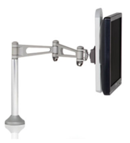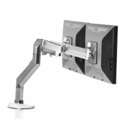 A range of polished aluminium with white trim adjustable monitor arms for use with flat panel computer monitors. The monitor arms are attached via clamp on the desk and are height and depth adjustable. Cables are hidden within the central post. A removable stop protects walls by preventing the monitor swinging too far. The dual LCD monitor has an internal counter balanced support crossbar that can support two monitors in the same horizontal plane.