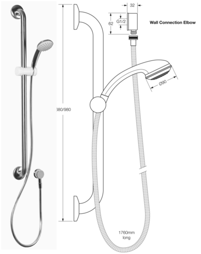 A wall mounted hand held shower attached to a vertical stainless steel grab rail with a brushed chrome finish and a reinforced hand shower hose. The chrome plated brass wall elbow features a dual check safety valve. The grab rail has a high impact plastic rail slider that allows for height adjustment.