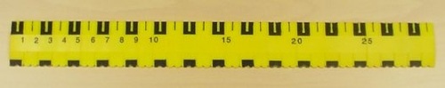 A yellow, plastic (polycarbonate) ruler with raised measurement markings each 5mm and 50mm. Each 10mm on the ruler alternates in colour - yellow and black for visual recognition. Designed to assist people with visual impairment.
