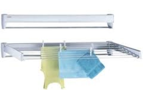 A plastic clothes dryer, with powder coated rails and one exposed chrome rail that pulls out from the wall and retracts when not in use.