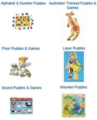 A range of puzzles, with a variety of sizes and numbers of pieces: Alphabet and number puzzles, Australian themes puzzles, Floor puzzles, Layer puzzles, Shape puzzles, Sound puzzles and wooden puzzles.