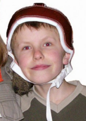 A thick vinyl foam soft shell helmet which is strapped under the chin with buckles. It protects the nape of the neck and sides of the head.