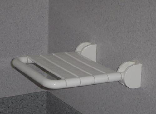 A wall mounted, folding shower seat consisting of an antibacterial protective nylon frame with a non-corrosive steel core, and seat bands made of nylon. Available in two sizes. The shower seat has cover caps for concealed fixing and steel reinforced hinges with a limiting device to allow the seat to be lowered gently into position. There is an automatic built-in stop in the lift-up position. The seat requires 80mm of space from the wall in the vertical position.