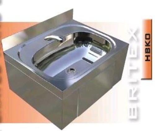 The basin is oval shaped and made from heavy duty stainless steel. It is suitable for healthcare facility settings. The unit is rectangular with the connections and plumbing concealed. The hinged panel at the front activates the water flow when pushed by the users knee.