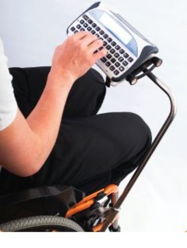 The LIGHTWRITER wheelchair mount consists of a quick-release LightWRITER SL40/50 mount plate, a tube connector, a right-angled rod, and a wheelchair clamp. The wheelchair clamp can be attached to horizontal or vertical round or square tubing. Three models are avaiable.