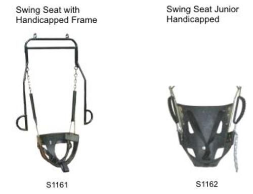 A supportive swing for a child. It includes a curved backrest and side supports with a front safety strap. Chains are provided to attach it to an existing swing frame. Available in two sizes.