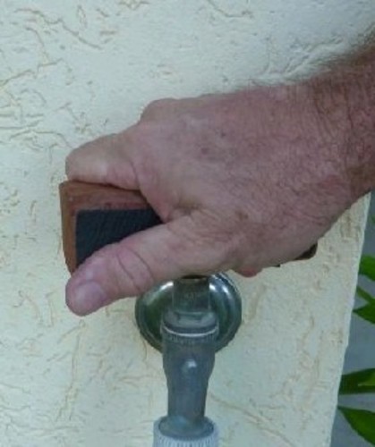 A wooden tap turner that slides over a common T style garden tap, providing a large wider grip to increase leverage.
