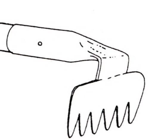A long handled crab weeder with a rake like head which is pulled through the ground to remove weeds. The weeder has a wooden handle and stainless steel head and is suitable for use in garden beds (such as rose beds).