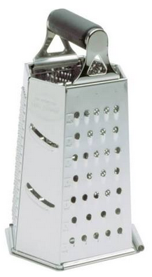 The grater has a handle at the top for stabIlisation and can be used with or without the catcher. Its six sides offer five choices of grating size and one for slicing. The catcher is clear plastic and is graduated for ounces and grams.
