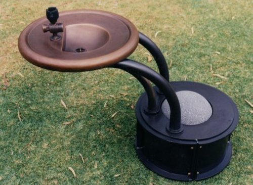 The fountains have a cast brass bowl with a standard finish (rough polish finish and bead blast). Floor mounted, galvanised steel assembly with removable semi circular access panels (concealing water supply and waste water piping) at the base. The support arms and base have a powder coated finish. The bubbler and control are one unit mounted in an upright position on top of the bowl. The control is a circular push button and the bubbler is brass with a rubber mouth guard. These have a standard finish. The insert is 'stonecast'. Height of the bowl above the ground can be customised to suit client specifications.