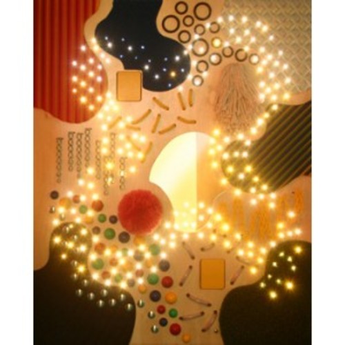 A brightly coloured board with a selection of tactile objects. Wall mounting is recommended. 600mm x 450mm.