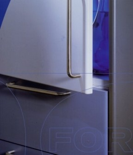 Plastic lamination of doors and drawers to produce a rolled edge as a protective guard against injury. Doors and drawers are customised to clients requirements. A range of colours is available.