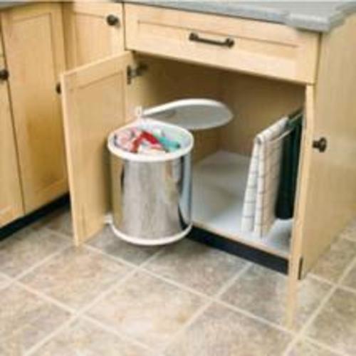 A plastic lidded rubbish bin which is mounted on the inside of a kitchen cupboard. When the cupboard door is opened the bin swings out and the lid lifts up.