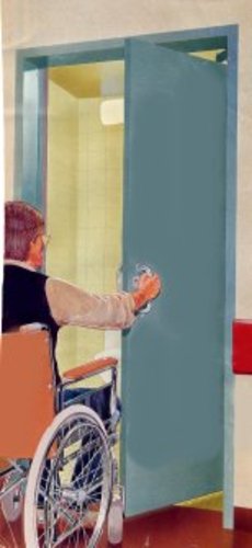 A single action pivot door which pivots at a point two thirds of the width of the door, thereby requiring a smaller door clearance space. The door is polystyrene filled and the hinge has ball bearings.