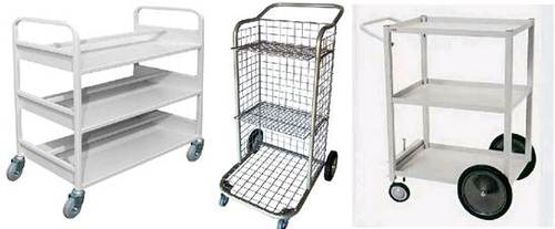 Range of trolleys available, including mobile trolleys with tier shelving, overhead projector trolley, mail cart, legal document carrier trolley, mobile trolleys with pull out tier metal wire draws.