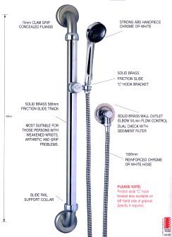 1. 'Clam flange' concealed grab rail slider with a 585mm solid brass friction slide track with a factory installed solid brass friction slide 'C' hook bracket. The friction slide is water assisted, allowing it to slide assisting a user with reduced strength. A spring within the bracket holds it in position against the rail, it does not lock. The 'C' hook pivots in a vertical plane, allowing the shower to be positioned as required. The bracket is positioned on the right side of the rail, but can be installed on the left if specified.