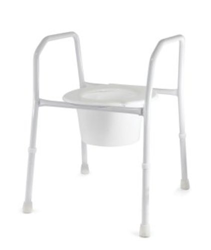 The height adjustable over toilet frame has rubber stoppers on the legs. The legs are splayed, with twice as many holes to allow for finer adjustment to accommodate an uneven floor. It is lightweight and able to accept a commode pan if required. The frame has a full plastic toilet seat.