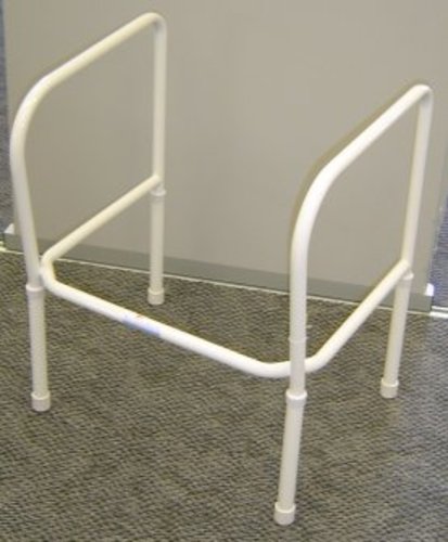 The toilet surround is constructed from tubular steel. The legs are straight (not splayed) and have rubber stoppers on the ends. They are height adjustable via a push button mechanism. One leg has twice as many holes to allow for an extra adjustment, to cope with an uneven floor surface.