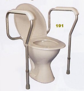 The armrests attach behind the toilet seat and share the toilet seat bolts. They are supported on two legs which are height adjustable using push button mechanism to suit toilet pan height. The legs have slip resistant rubber stoppers on the ends. The armrests are moulded white plastic and the frame is a stainless steel finish. The arms are hinged on a frame that attaches to the toilet and can be lifted from the floor approximately 100mm for cleaning purposes.