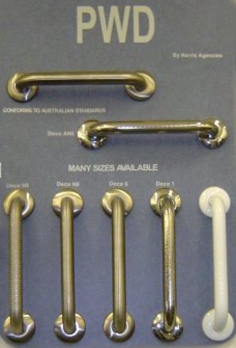 A range of stainless steel grab rails intended for use around the toilet, shower or bath. They are wall or floor to wall mounted. A range of different configurations are available and all conform to Australian standards. A range of finishes are available.
