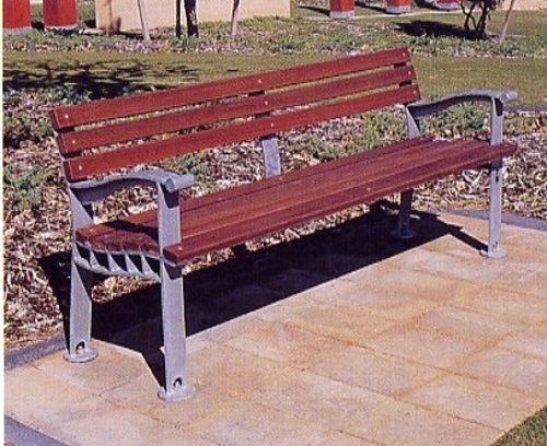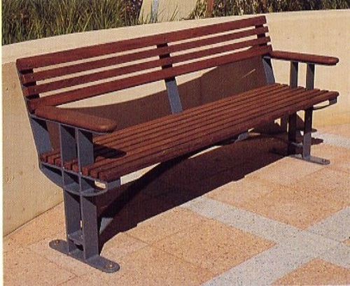 A range of park bench style seats which feature armrests and a backrest. Constructed from a galvanised steel frame with wooden slates for the seat / backrest. Available in a range of styles and finishes.