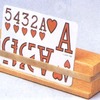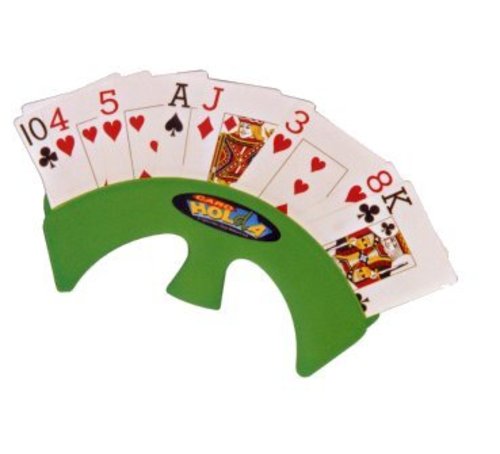 A plastic card holder, which holds cards in a fan formation. Can be hand held or placed on a table surface. Specifically designed with children in mind. May also be available in generic toy and games stores.