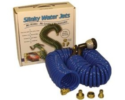 A polyurethane recoil hose that stretches out to 16m and recoils to 80cm. It comes with two brass ball bearing quick connector hose fittings, two different sized tap adaptors and a six pattern trigger spray (with brass internal fitting and adaptor). The deluxe model includes a hose holder.