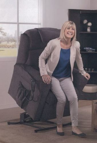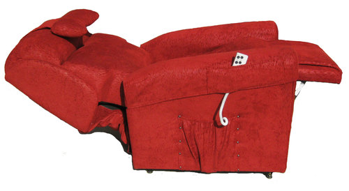 A custom made electrically operated steel and timber frame, foam padded high back lift chair with elevating leg rest, stand up function and reclining backrest. The chair has full length padded fixed armrests. The fully dry cleanable overlay and removable arm covers protects the chair. Emergency battery backup in the event of a power cut. Available in a range of upholstery options including fabric, vinyl and leather. . Maximum user capacity of 120kg.