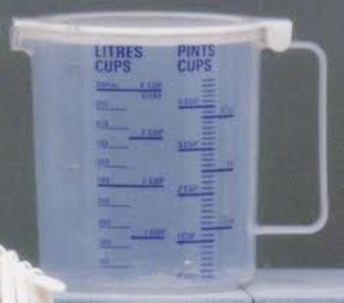 A lightweight, translucent plastic jug. The jug has a removable airtight lid, a slip type spout cover, and graduations at 250mls intervals. The closed end handle extends the full length of the jug with the distance from the bowl being 30mm.