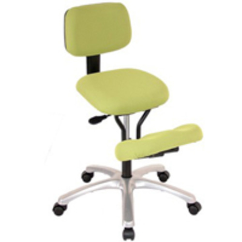 A kneel sit chair with a forward slanting padded seat and supportive knee pad. It has a metal five star castor base and the seat is height adjustable. It also has a padded backrest and the option of locking castors.