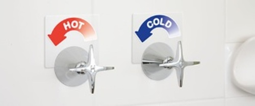 Safe Tap Tags are a removable signage system designed for use with wall mounted bath & shower taps. They help the user safely moderate the water temperature by showing how to reduce the flow of hot, or increase the flow of cold water at a glance. Made from waterproof polypropylene, they fit neatly between the tap flange and the wall and remove easily for cleaning.