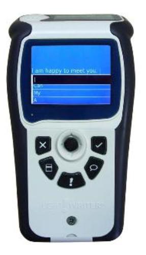 The Lightwriter Swift is a pocket-sized, text-to-speech communication device with two displays. The second display is positioned so that it can be read by a communication partner. Messages can be pre-stored or the joystick can be used to spell messages using the onscreen keyboard. The messages are spoken using the Acapella text-to-speech voices. Up to nine messages can also be recorded for natural expression.
