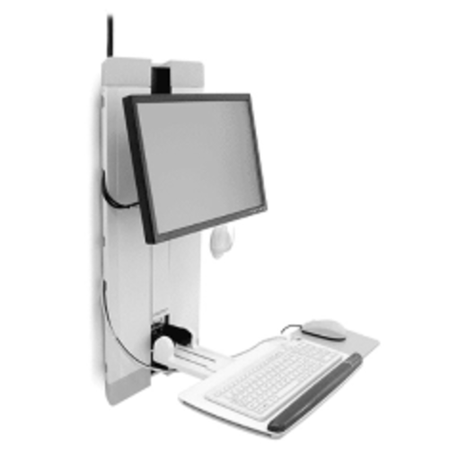 A low profile steel integrated ergonomic vertical lift system for screen and keyboard. The screen can lift vertically 230mm (9") and is counterbalanced for smooth adjustment. Both the keyboard and screen can pan side to side. The mouse pad can be fitted on right or left side. It includes mouse pad, wrist reset, mouse pouch and scanner holder as standard. There is a cable management system.