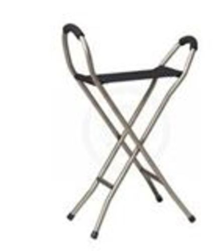 A folding, aluminium frame with a canvas sling seat that can also be used as a walking stick. The seat features foam grip handles on either side.