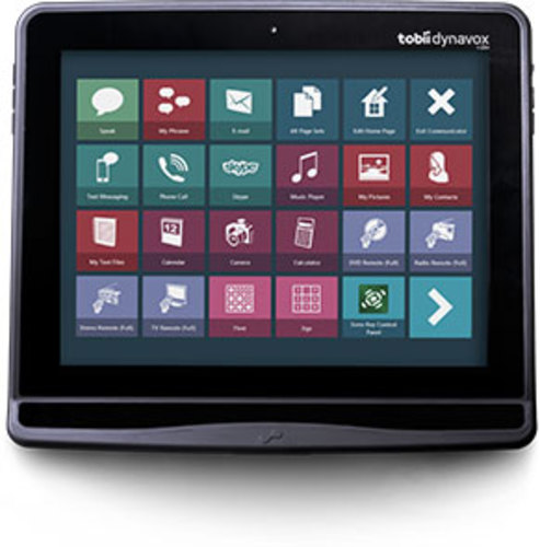 The Tobii Dynavox I-12+ is a Windows based speech generating device which uses synthesized speech. Text or symbols can be used to create messages. Email, text message, chat and computer applications access is available. The Tobii Dynavox I-12+ can be used for environmental controls (ECU). An eyegaze unit can be added on. Input methods include: Touchscreen, keyboard and mouse, switches, eye control.