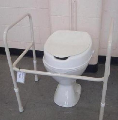 This free standing toilet frame fits around a toilet to assist transfers. It is made from epoxy coated steel, is non folding and is height adjustable via a push button mechanism on each leg. The frame has additional width between the armrests than a standard over toilet frame.