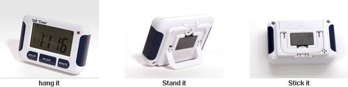 A reminder device which can be programmed to have up to 8 alarms per day. Alarms are recurring unless turned off. It features a red LED light which acts as a visual alert or missed dose reminder. The audible alarm stops after 1 minute but the light will continue to flash until the alarm in acknowledged. Also features a countdown timer. The device can be hung on a hook, stood on a surface or stuck to a metallic surface