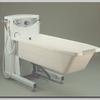 A white free standing bath with a stainless steel frame and pre-moulded fibreglass shell. It has an inward opening side door that allows the user to "walk in" to the bath. The internal seat is integrated within the shell of the bath and has a non slip surface on the seat and flooring. Available in standard, deluxe and grand models.