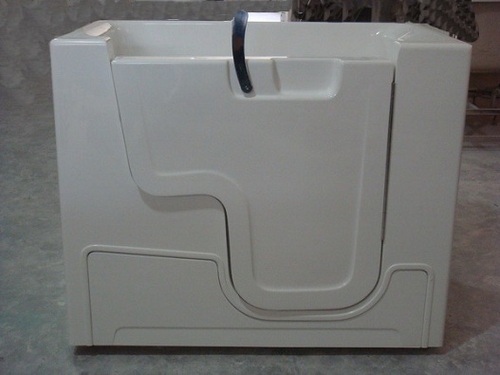 A white free standing bath with a stainless steel frame and pre-moulded fibreglass shell. It has an outward opening side door that allows the user to "walk in" or slide transfer into the bath. The internal seat is integrated within the shell of the bath and has a non slip surface on the seat and flooring. Available in two models.