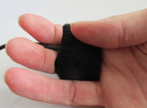 The FingerButton 30 is a small single action switch. The switch is encased within a hook and loop tape strap and is designed to be wrapped around the fingers.