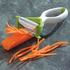 A Y-shaped vegetable peeler with horizontal serrated blade and a large, slip-resistant handle. When you begin to peel the fruit or vegetable, perfect julienne strips are cut out. The clear safety cover flips out of the way while you peel, but locks back into place as a protective cover during storage. May assist people who have difficulty holding standard peelers.