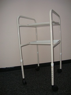 A lightweight, height adjustable mobile traymobile with two white plastic removable trays. It features a powder coated steel frame in a cream colour. Adjustable in height with a push button mechanism. Two removable white plastic trays.
